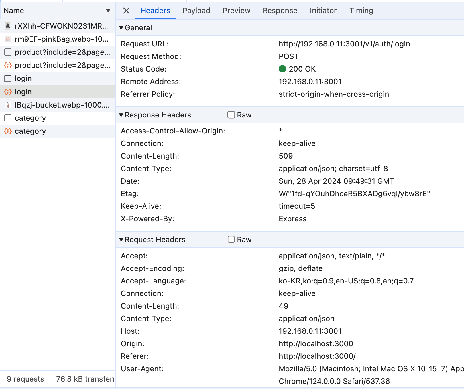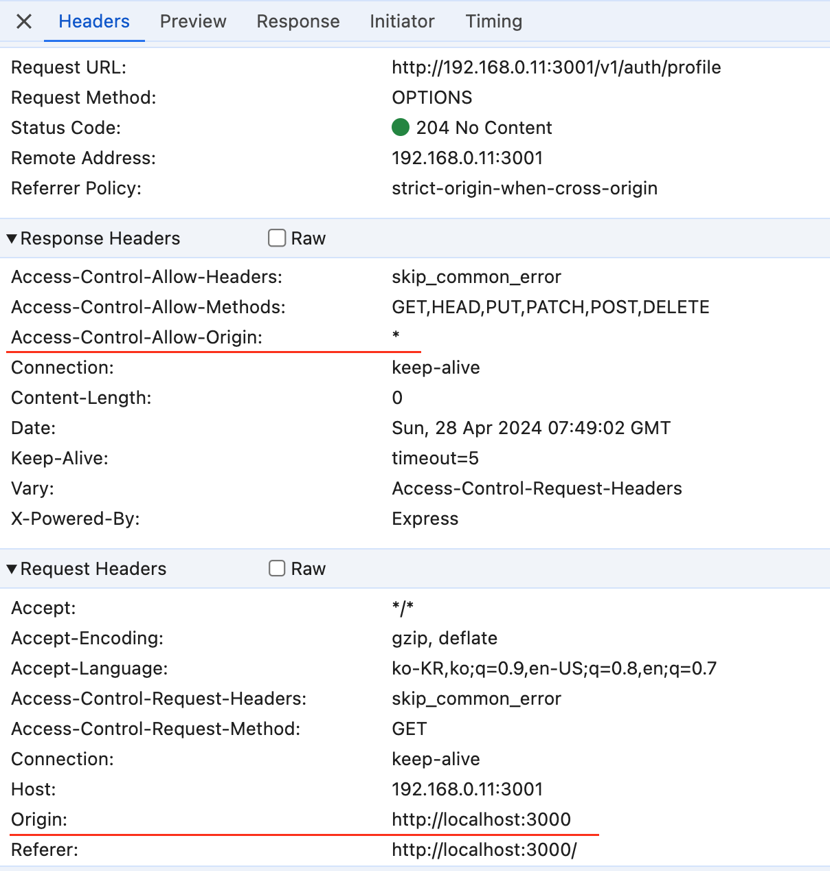 2. 응답 헤더 : 서버 응답시 access-control-allow-origin 에 리소스 접근을 허용할 origin값을 설정함 (*는 모두 허용)