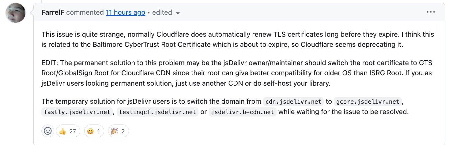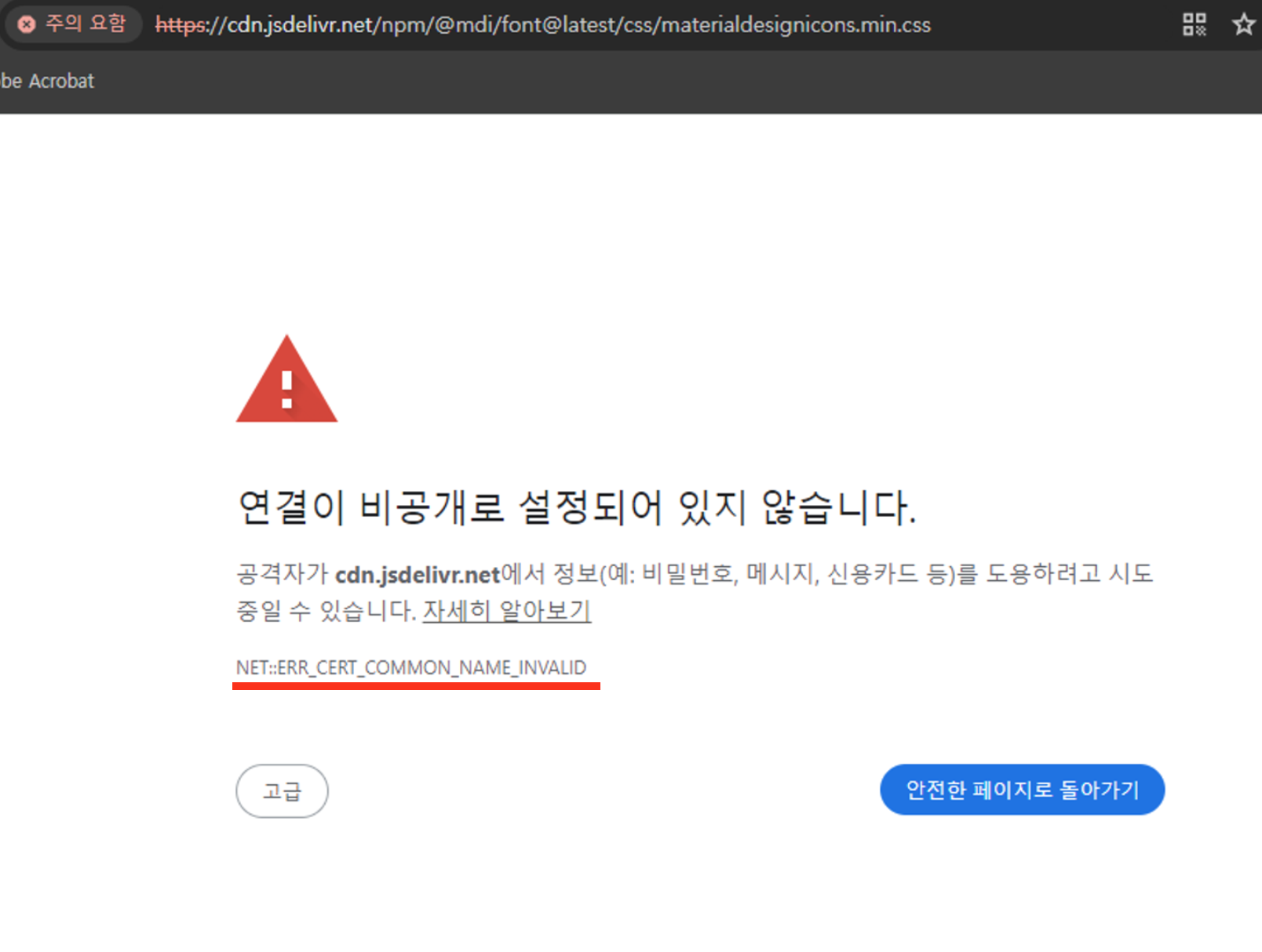 확인해보니, jsdelivrd에서 ssl 인증서 만료됐는데 갱신되지 않아 발생한 이슈였다.