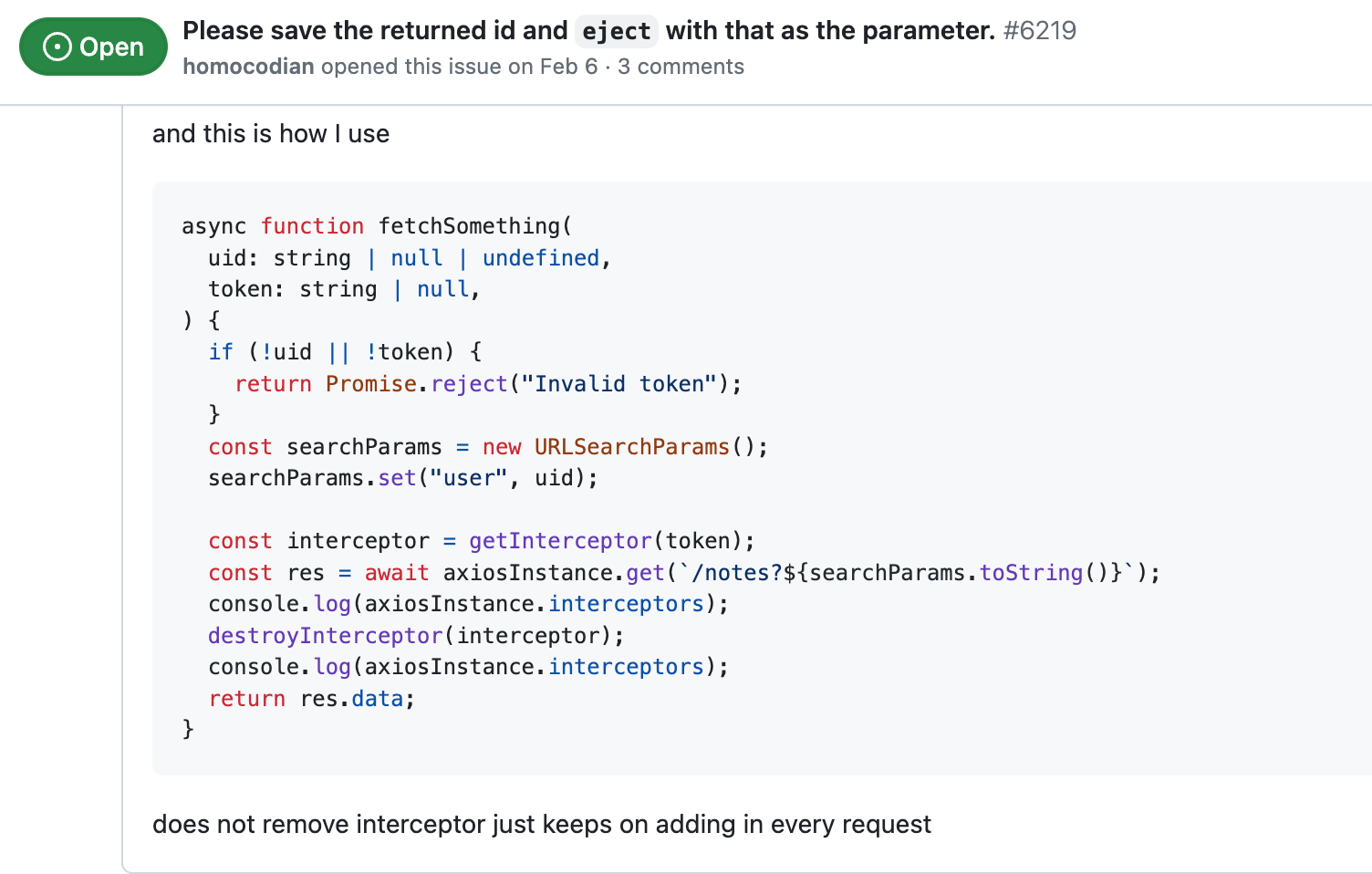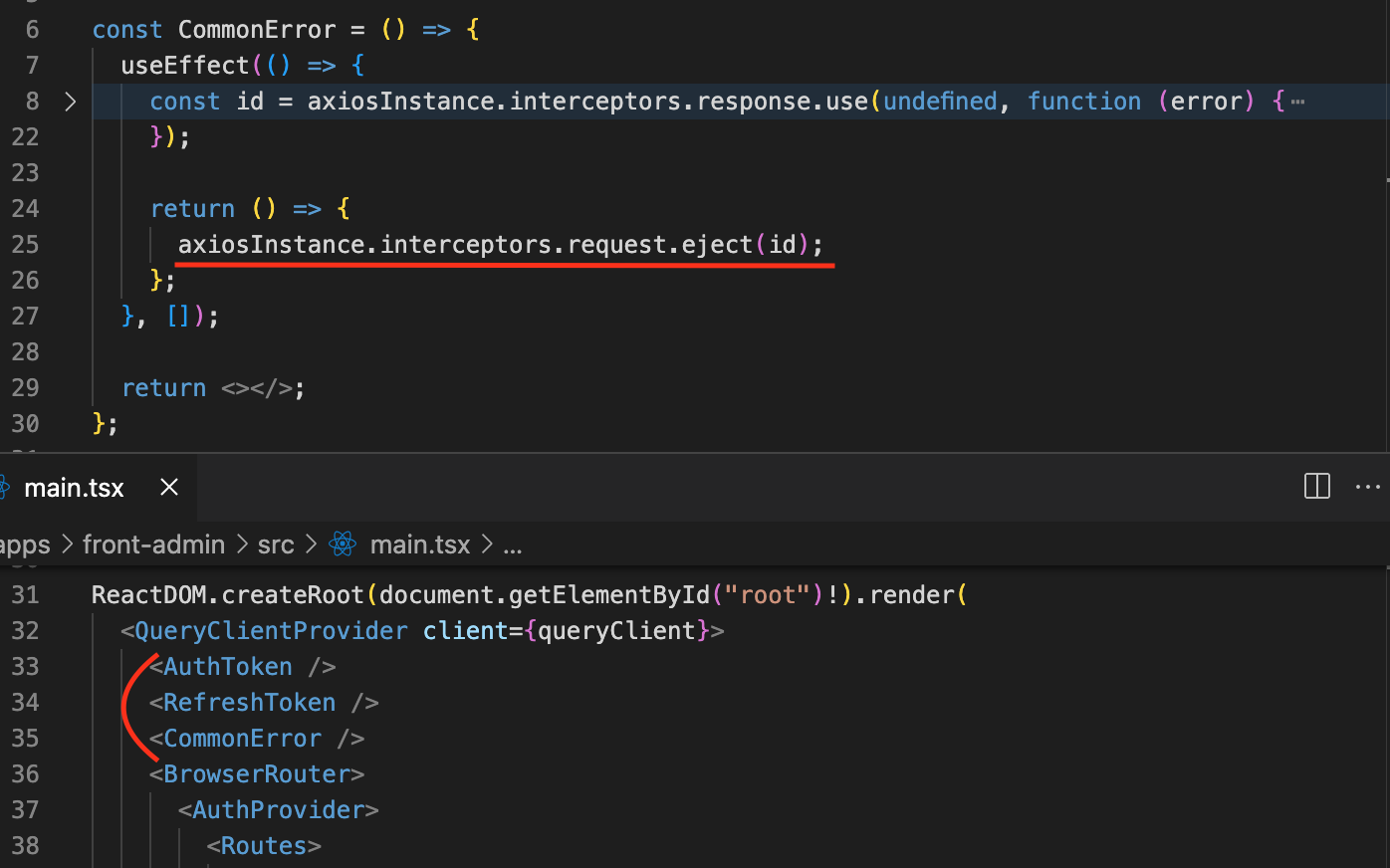 그러나 인터셉터를 전역에 설정해줬기 때문에, 앱이 꺼지지 않는한 인터셉터가 계속 살아있다.