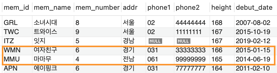 SELECT * FROM member WHERE mem_name='에이핑크' OR mem_name='마마무'; -- AND