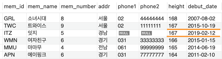 -- 정렬2. 키가 같은 멤버가 있다면 그 결과를 다시 먼저 데뷔한 순으로 정렬