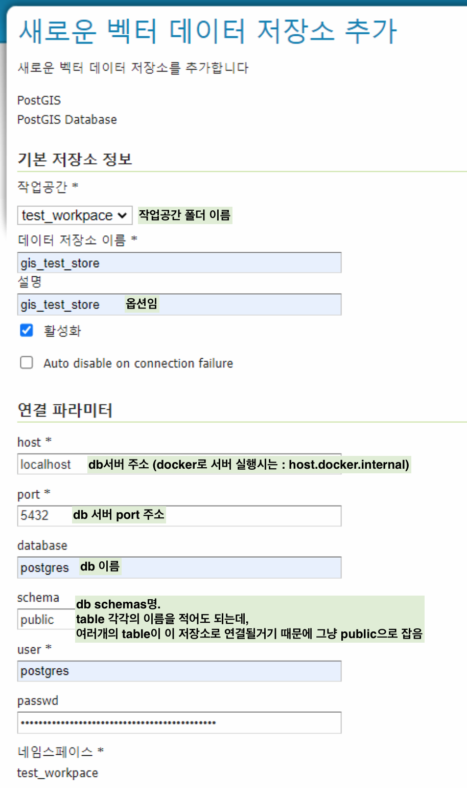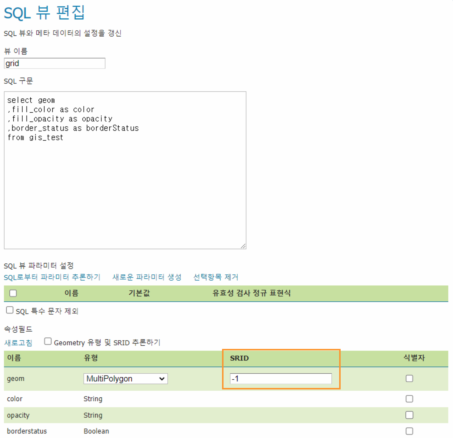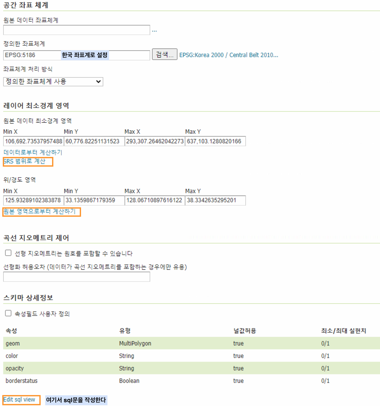 : GeoServer는 지오메트리 컬럼 타입으로 기본 SRID를 결정하려고 하지만 필요한 경우 이를 확인하고 수정해야 한다.