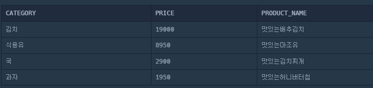 select CATEGORY,PRICE,PRODUCT_NAME // 4. 이후 뽑아야 하는 컬럼명만 출력