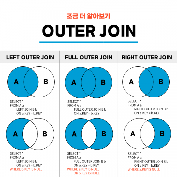 - (LEFT OUTER JOIN에서만) OUTER를 생략 가능 : LEFT OUTER JOIN ON => LEFT JOIN ON