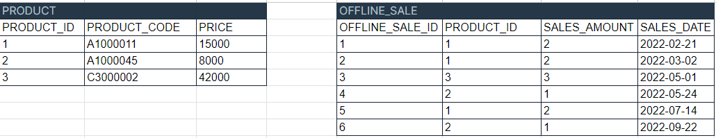 -- 1. PRODUCT 테이블의 PRODUCT_ID와 OFFLINE_SALE 테이블의 PRODUCT_ID가 같은 조건으로