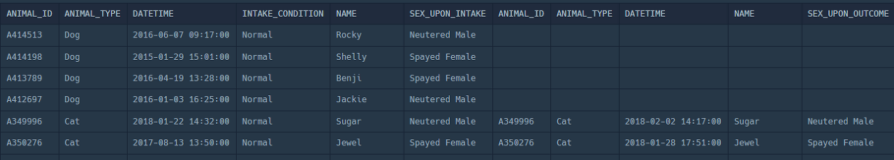 from ANIMAL_INS LEFT OUTER JOIN ANIMAL_OUTS # 2. INS테이블 전체 + OUTS테이블은 INS와 ID가 겹치는 것만