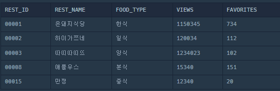 - 기존 테이블과 max값을 조회한 테이블을 조인시키는데, 이때 조인 조건은 두 테이블간 FOOD_TYPE과 FAVORITES가 같아야 한다.