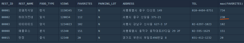 - 문제 : 단순히 젤 첫번째 FOOD_TYPE 행만 나오고, max 요건은 따지지 않음.