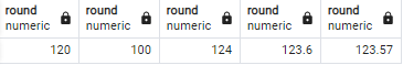 select ROUND(123.567,-1), ROUND(123.567,-2), ROUND(123.567,0), ROUND(123.567,1), ROUND(123.567,2);
