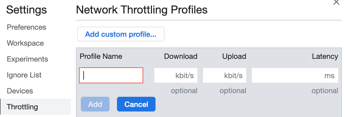 - Slow 3G: 500kb/s, 500kb/s, 2000ms